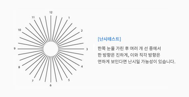 스넬렌 차트를 이용한 기본적인 시력 측정으로 시작합니다. 난시가 있으면 특정 방향의 선이 더 흐리게 보입니다.