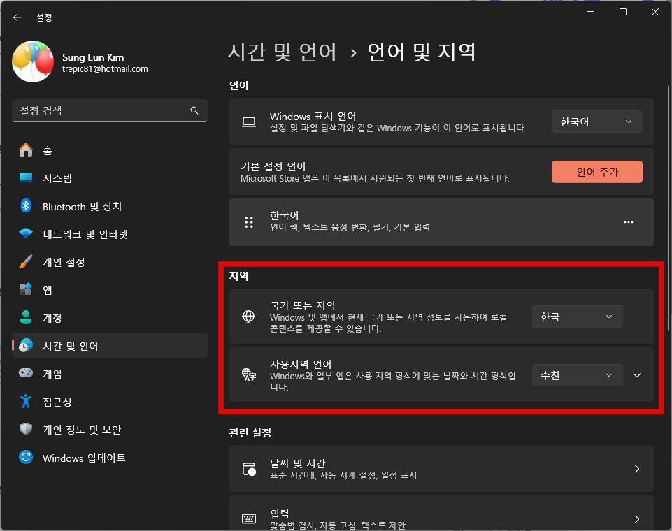 국가/지역 설정을 변경하면 해당 지역의 표준 날짜, 시간, 숫자 형식이 자동으로 적용됩니다. 이는 Microsoft Store의 지역별 콘텐츠 표시에도 영향을 미칩니다.